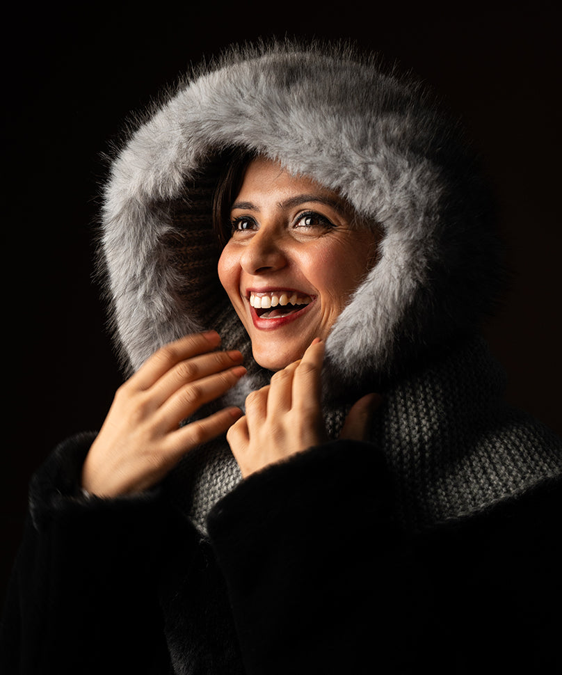 • Design: Faux-fur hood with textured knitted shoulder coverage