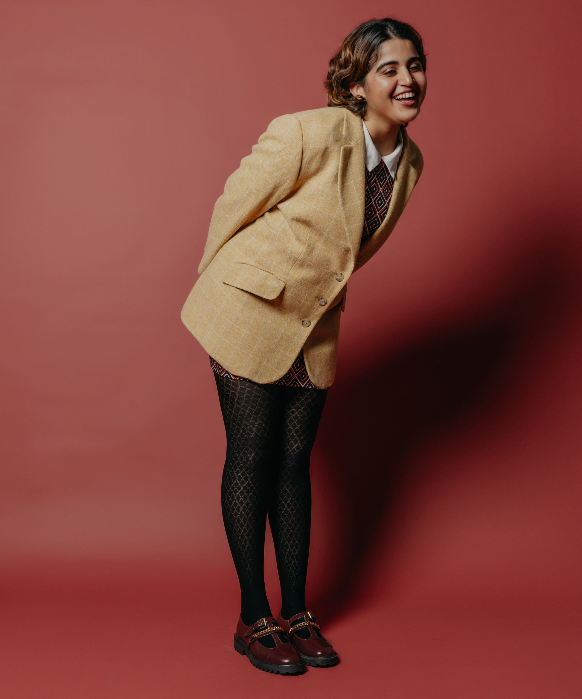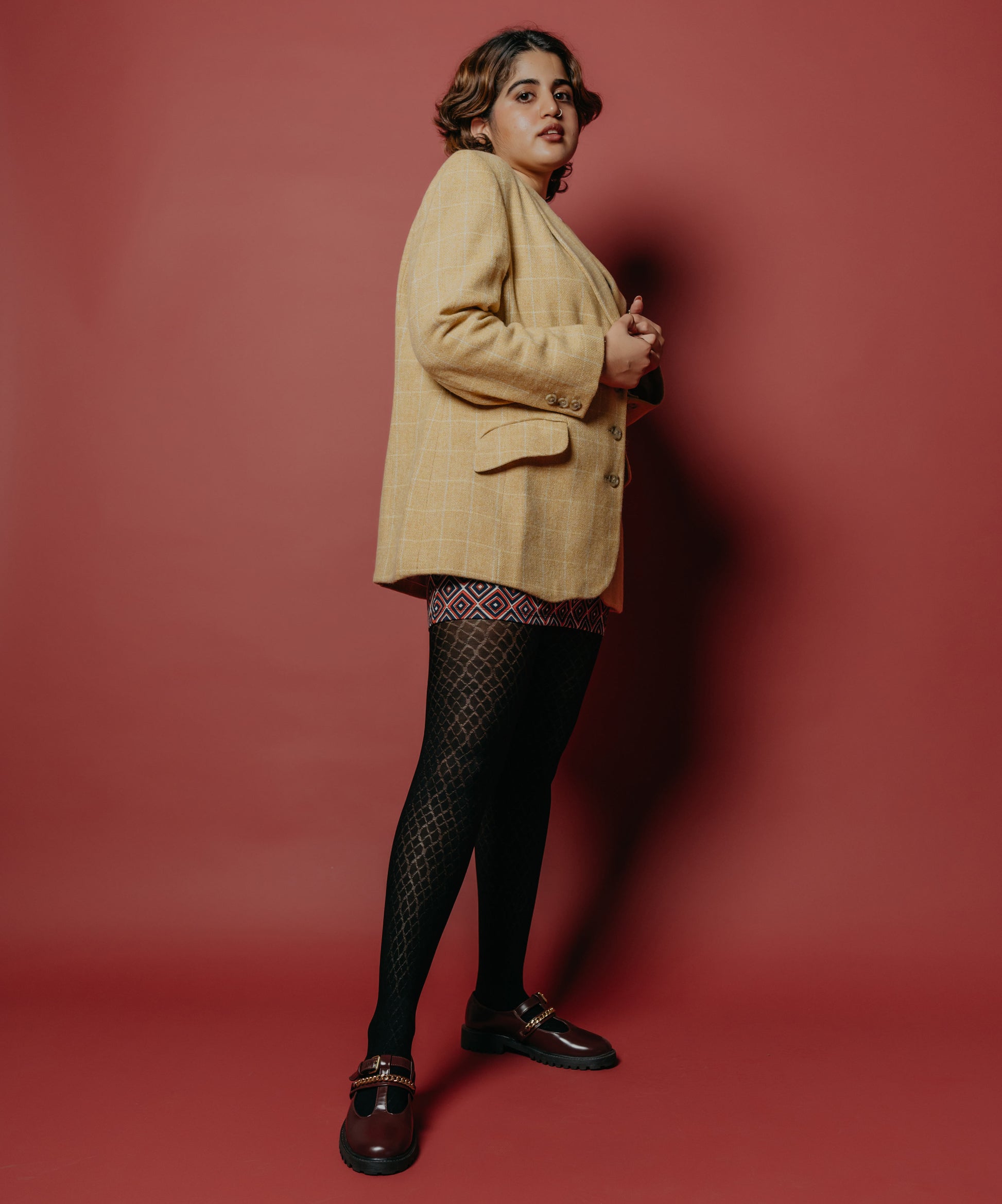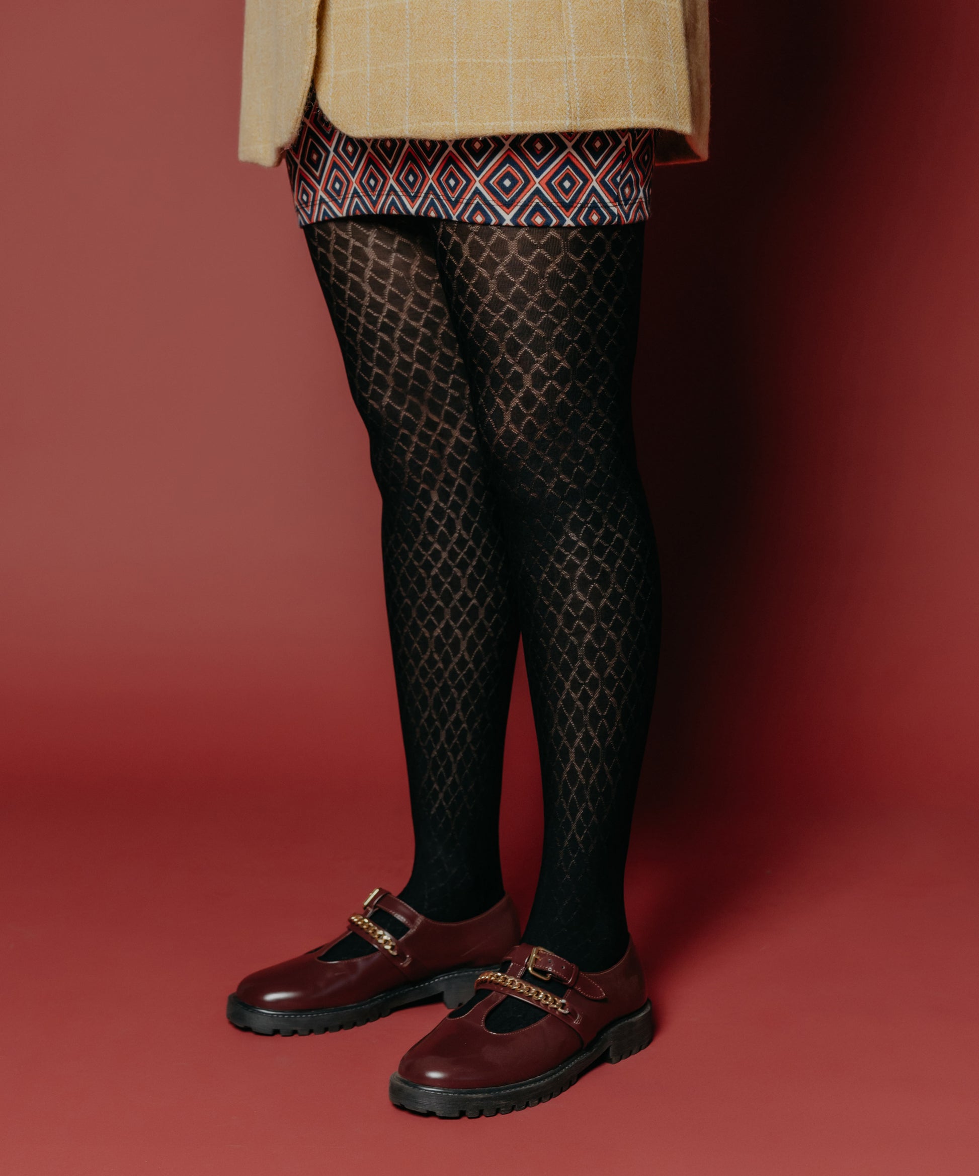 A cold night out, some spaghetti, and a pair of “Honeycomb Stockings”, whether you are out with friends or it's just a solo date these abstract patterns are bound to pair beautifully well with a trench coat, black loafers, and a dramatic personality.