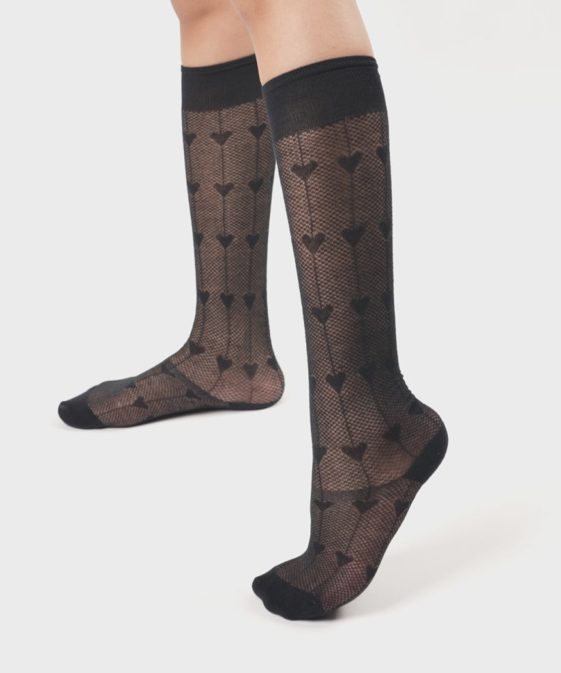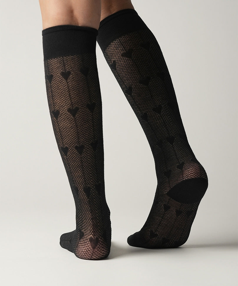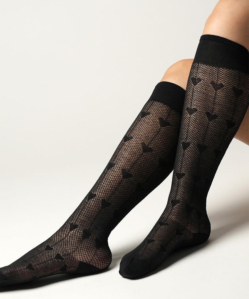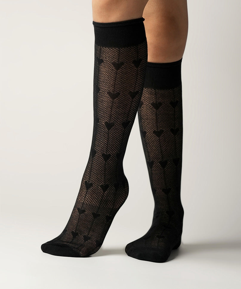 Sheer Black socks very seldom come with such grace. Mina is the perfect choice for a sunny day or a winter evening and that is why it is special. The beautiful knee length comes with some intricate details that will pair wonderfully well with both monotones and contrast patterns.