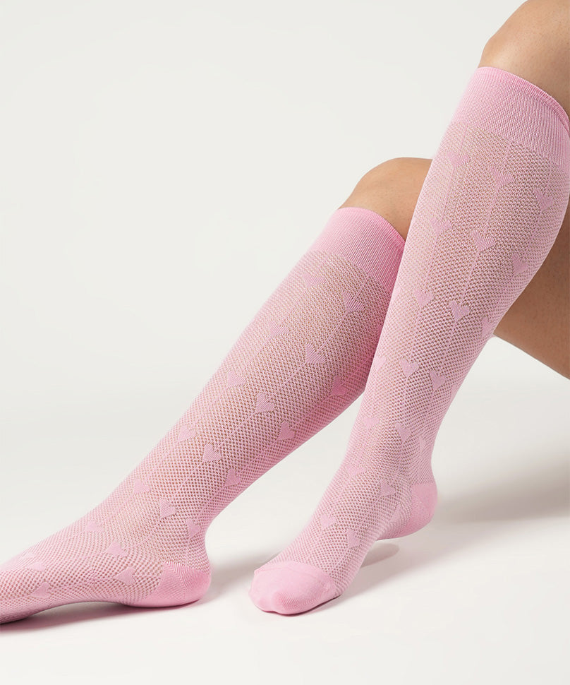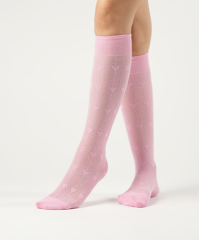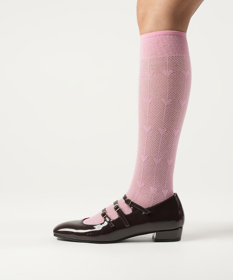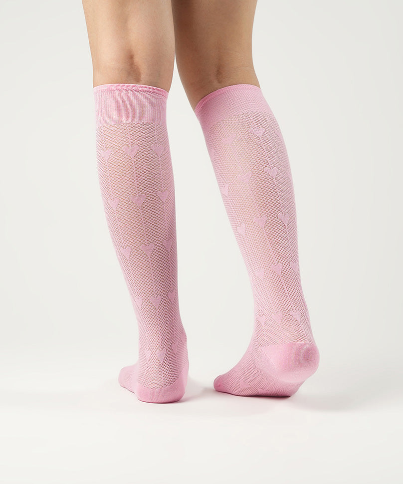Sheer Pink socks very seldom come with such grace. Mina is the perfect choice for a sunny day or a winter evening and that is why it is special. The beautiful knee length comes with some intricate details that will pair wonderfully well with both monotones and contrast patterns.