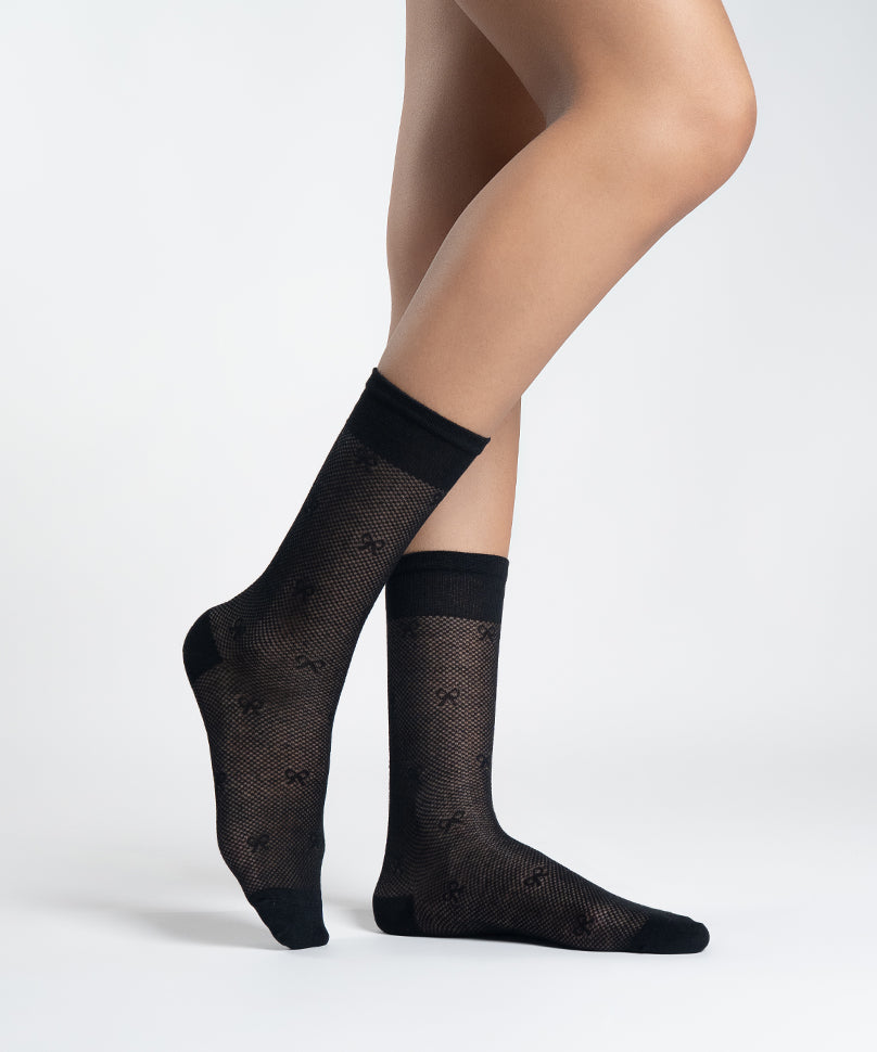 A subtle statement that speaks volumes — Team Jolt is your everyday essential with a touch of playful sophistication. The sheer black knit, detailed with delicate bow motifs, adds a refined charm that transitions seamlessly from desk to dinner. Pair them with loafers, pumps, or ankle boots for an effortlessly polished finish.