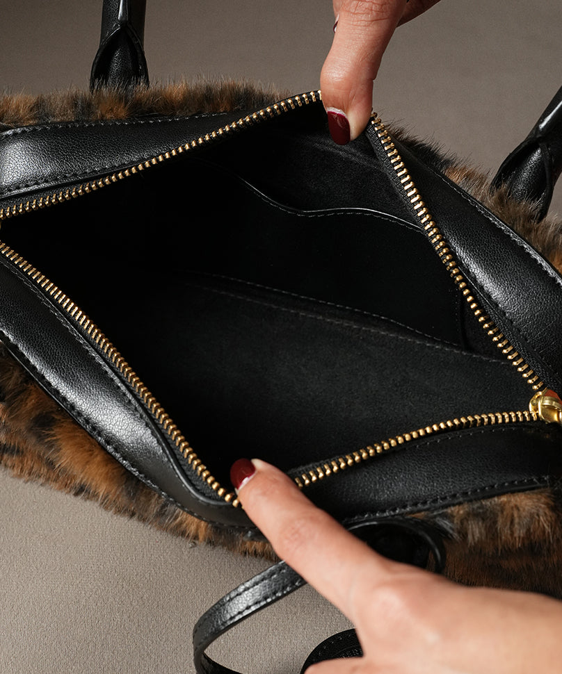 • Store the fur handbag in a cool, dry place to protect the fur’s quality. Regularly comb the fur to keep it soft and shiny, and clean gently with a damp cloth if needed.